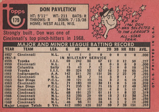 Catcher Don Pavletich appeared in a single game with the Reds in 1957, another single game with the team in 1959 and then went two full seasons in the minors before returning for 34 games in 1962. He then spent seven seasons with Cincinnati as the back-up first to All-Star Johnny Edwards (#186) and then to future Hall of Famer Johnny Bench (#95). Pavletich's best season came in 1966 when he appeared in a career-high 83 games, making 46 starts behind the plate, including on opening day. He batted .294 that season, with 12 home runs and 38 RBIs, both career bests. He was dealt to the White Sox before the 1969 season, and he'd spend the year in Chicago as the back-up for Ed Hermann. Pavletich retired following two seasons in Boston, in which he appeared in only 46 games. He had been dealt to the Brewers following the 1971 season, but the team released him at the end of spring training in 1972. In 536 career games, Pavletich batted .254 with 46 home runs and 193 RBIs.